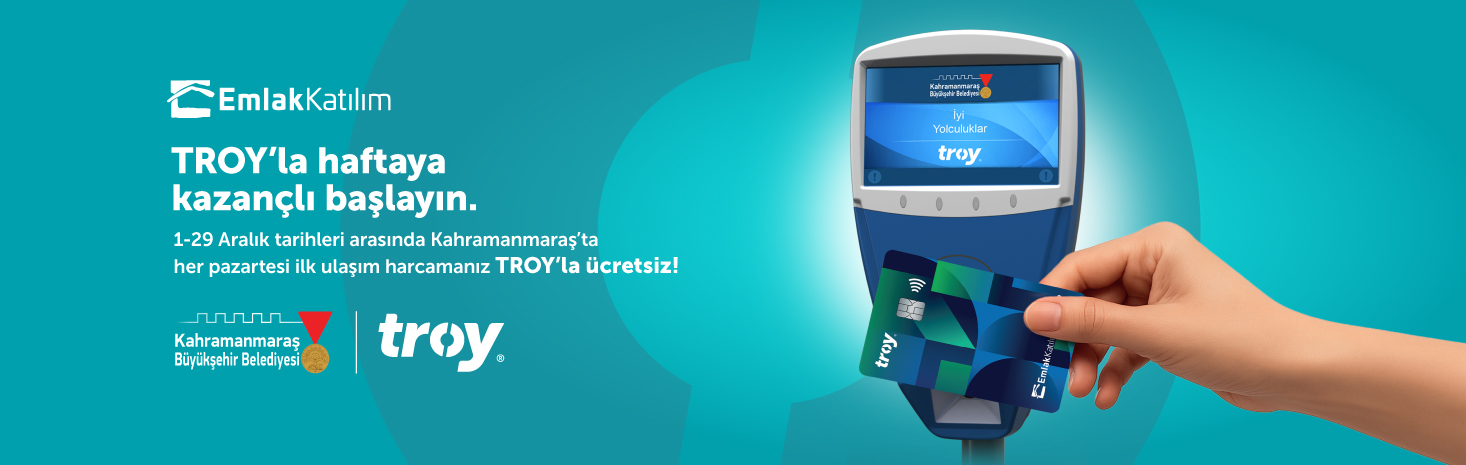 Kahramanmaraş'ta TROY'la Haftaya Kazançlı Başlayın! Kampanya Detayları; Kampanya 1 Aralık 2025 saat 00.01 ile 29 Aralık 2025 saat 23.59 arasında ve sadece pazartesi günleri geçerli olacaktır. Kampanya döneminde her pazartesi günü, TROY logolu temassız özellikli kartlarla yapılan ilk ulaşım ödemesi TROY tarafından karşılanacaktır. Kampanya, TROY logolu temassız özellikli, kredi kartı ile yapılan işlemlerde geçerlidir. Kampanya, Kahramanmaraş Belediyesi’ne bağlı şehir içi, ilçe ve belde toplu taşıma hatlarında geçerlidir. Her bir TROY logolu temassız kart, kampanya süresince her pazartesi günü kampanyadan yalnızca 1 (bir) kez faydalanabilir. Ücretsiz geçiş, ödeme sırasında otomatik olarak devreye girer ve kart sahiplerinden herhangi bir ücret tahsil edilmez. Kart sahiplerinin kampanyadan yararlanmak için ayrıca bir işlem yapmasına gerek yoktur. Ödeme noktasında, ekranda ödeme tutarı gösterilecektir; ancak bu ücret TROY kart kullanıcısına yansıtılmayacak ve BKM (TROY) tarafından karşılanacaktır. BKM, kampanyayı durdurma veya kampanya koşullarında değişiklik yapma hakkını saklı tutar.
