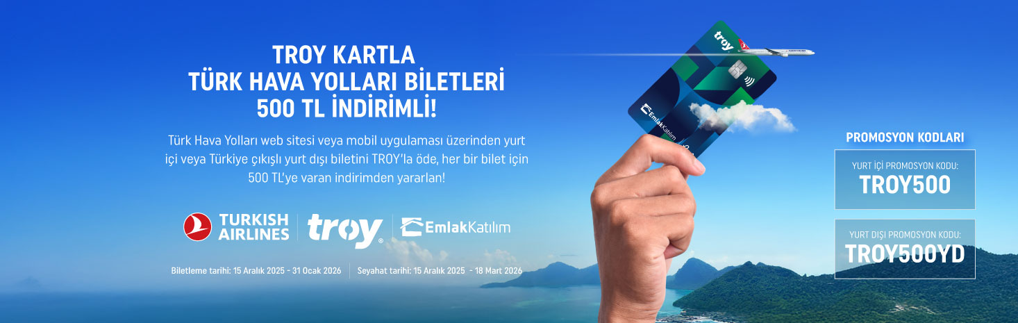 TROY Kartla Türk Hava Yolları Biletleri 500 TL İndirimli! Kampanya Bilet Satın Alım Tarihi: 15 Aralık 2025 – 31 Ocak 2026 Uçuş Tarihleri: 15 Aralık 2025 – 18 Mart 2026 TROY Kart’a özel 500 TL indirimden faydalanmak için www.turkishairlines.com ve Türk Hava Yolları mobil uygulamasındaki “Promosyon Kodu” alanına yurt içi uçak bileti alımları için TROY500, Türkiye çıkışlı yurt dışı uçak bileti alımları için TROY500YD indirim kodunun girilmesi gerekmektedir. Kampanya Koşulları: Kampanya TROY logolu kartlarla 15 Aralık 2025 00:01 – 31 Ocak 2026 23:59 arasında turkishairlines.com ve Türk Hava Yolları mobil uygulaması üzerinden düzenlenen ve seyahat tarihi 15 Aralık 2025 saat 00:01 – 18 Mart 2026 saat 23:59 arasındaki Türk Hava Yolları tarifeli yurt içi ve Türkiye çıkışlı yurt dışı uçuşlarda geçerlidir. Kampanya kapsamında alınacak gidiş dönüş uçak biletlerinde dönüş uçuşunun da en geç 18 Mart 2026 tarihinde 23:59’da tamamlanmış olması gerekmektedir. Kampanyanın geçerli olduğu tarihler Türkiye lokal saatine göre uygulanacaktır. Kampanya TROY logolu bireysel kredi kartlarıyla yapılacak bilet satın alımlarında geçerlidir. Kampanya, tek yön ya da gidiş-dönüş, Economy ve Business Class uçuşlarda geçerlidir. İndirim kodları, çoklu uçuşlarda geçerli değildir. Kampanya kapsamında uygulanacak indirimden faydalanmak için, yurt içi uçak bileti alımları için TROY500, Türkiye çıkışlı yurt dışı uçak bileti alımları için TROY500YD indirim kodunun kullanılması gerekmektedir. İndirim, turkishairlines.com ve Türk Hava Yolları mobil uygulaması uçak bileti ödeme sayfasında belirlenmiş indirim kodlarının, kredi kartı / banka kartı ödeme tipi seçildikten sonra çıkan “Promosyon Kodu” alanına uçuş parkuruna uygun şekilde girilmesi ve onaylanmasından sonra uygulanacaktır. İndirim vergiler hariç baz ücret üzerinden uygulanacaktır. Kampanya kapsamında toplam indirim tutarı baz ücretin 500 TL altında olması durumunda değişkenlik gösterebilir. Yolcu başına uygulanabilecek en yüksek indirim tutarı 500 TL olup vergilere indirim uygulanmaz. Biletin baz ücretinin 500 TL’nin altında olması durumunda baz ücret tutarı kadar indirim yapılır. Kampanya kapsamında sunulan indirim tutarı yolcu başınadır. Bir PNR numarası altında en fazla 7 yolcu için bilet alınabilir. Değişiklik ve iptal durumunda ücret sınıfı kuralları geçerlidir. Değişiklik durumunda oluşturulan yeni bilette indirim uygulanmaz. İndirim tutarı, çocuk ve bebek yolcular için değişiklik gösterebilir. Kampanya kapsamında sunulan indirim kodlarının kullanımı limitlidir. Kampanya, indirim kodlarını kullanan toplam yolcu sayısına göre sınırlandırılmıştır. Yurt içi bilet alımlarında kullanılacak TROY500 indirim kodu 80.000, yurt dışı bilet alımlarında kullanılacak TROY500YD indirim kodu 20.000 yolcu tarafından kullanılabilir. Kampanya diğer Türk Hava Yolları kampanyaları ile birleştirilemez. Kampanya, indirimli yolcu tipleri için geçerli değildir. İndirim kodu bölünemez ya da paraya çevrilemez. BKM Express, Google Pay, TK Pay vb. cüzdan üzerinden kullanılan TROY kart ile ödeme yöntemleri kampanya kapsamının dışındadır. Kampanya, Ajet seferlerinde, Türk Hava Yolları codeshare seferlerde ve Star Alliance partner hava yolları seferlerinde geçerli değildir. Türk Hava Yolları herhangi bir kural ihlali tespit edilmesi durumunda ilgililer hakkında hukuki işlem başlatma hakkını saklı tutar. Kampanyaya katılan herkes kampanya koşullarını kabul etmiş sayılır. Türk Hava Yolları, Emlak Katılım Bankası ve Bankalararası Kart Merkezi (BKM) kampanya kural ve koşullarını, tanımları ve diğer bilgileri değiştirme, kampanyayı iptal etme hakkını saklı tutar. Hizmetin verilmesi ve/veya indirimlerin yansıtılması ile ilgili yaşanabilecek teknik ya da operasyonel sorun ve aksaklıklardan BKM sorumlu değildir.